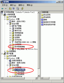 处理此功能的组策略的特定方面称为"软件限制策略",可以通过标准组策略 MMC 管理单元访问它。下图显示组策略 MMC 屏幕,其中显示可以同时为计算机和用户设置软件限制策略的路径: