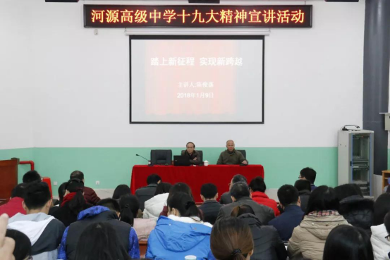 党的“十九大”是在我国进入全面建成小康社会决胜阶段、中国特色社会主义发展关键时期召开的一次意义重大、影响深远的大会。为深入学习贯彻党的“十九大”精神,引导全体教职工深入学习和领会“十九大”的报告内容及精神实质,1月9日下午,河源高级中学举行学习贯彻党的“十九大”精神宣讲活动,学校全体教职工参与宣讲活动。本次宣讲活动由河源市教育局党组成员、副局长陈俊荡主讲,由学校党支部书记、校长马敢飞主持。