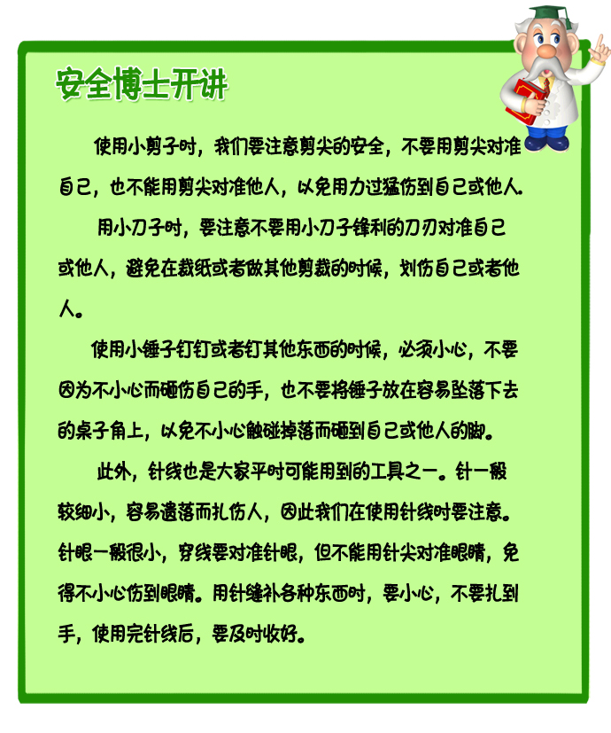 在手工课上,小剪子、小刀子、小锤子是我们常用的工具,这些工具有的有尖,有的有锋利的刀刃,有的容易砸伤人的手。我们使用这些工具时一定要注意安全,免得伤到自己或他人。