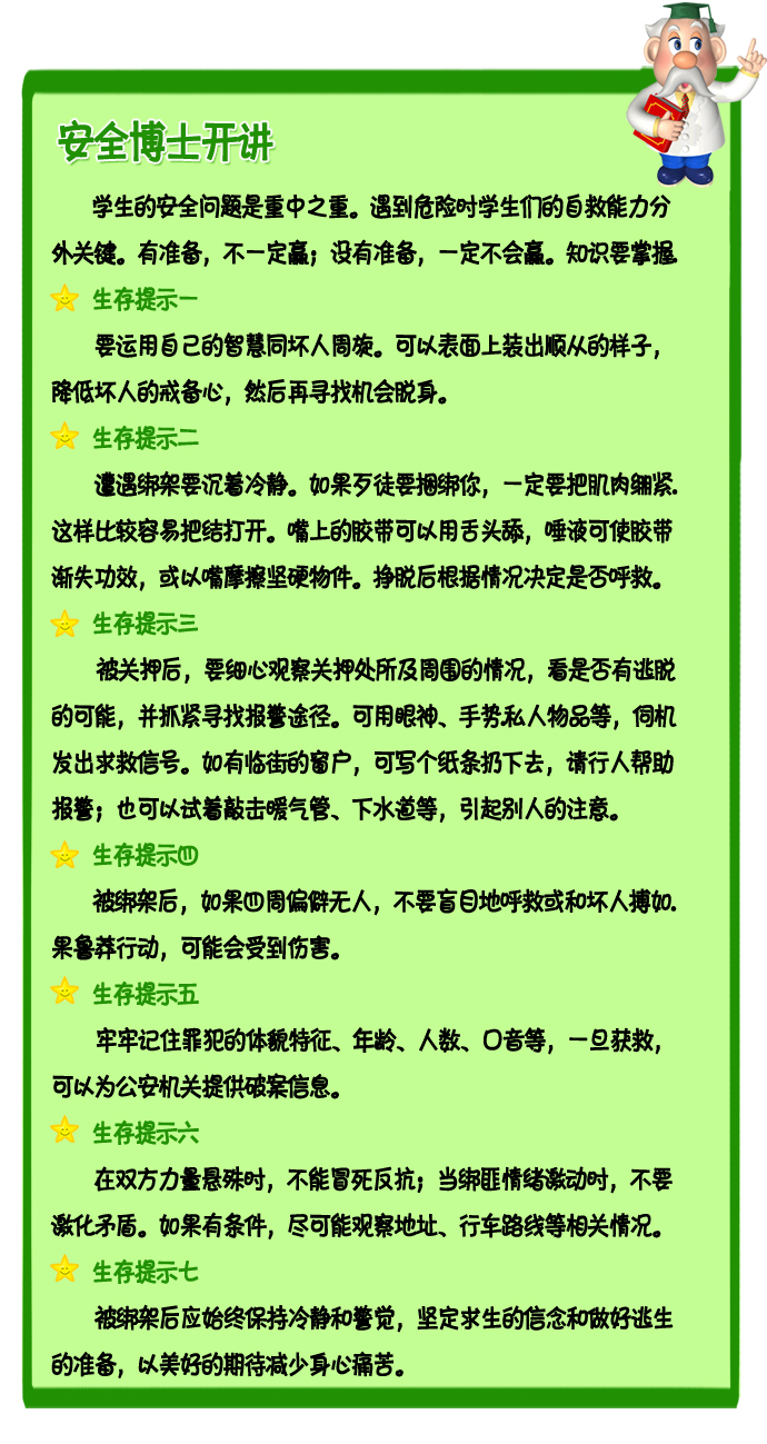绑架经常会发生在学生身上,这个时候一定不要惊慌,要积极地想办法进行自救或者寻求别人的帮助。
