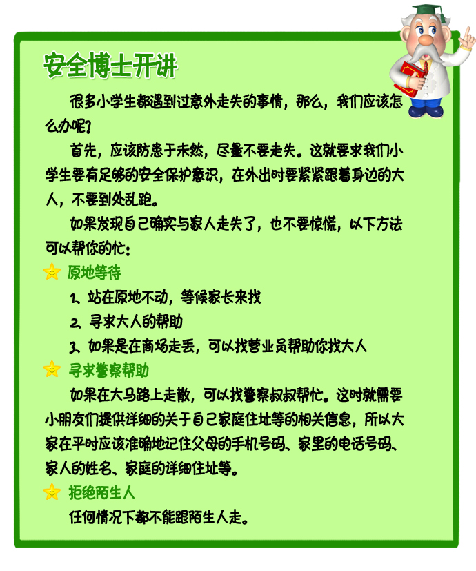 在人多或不熟悉的地方,我们很容易走失或迷路,此时千万不要惊慌,让安全博士来告诉你该怎么办吧!