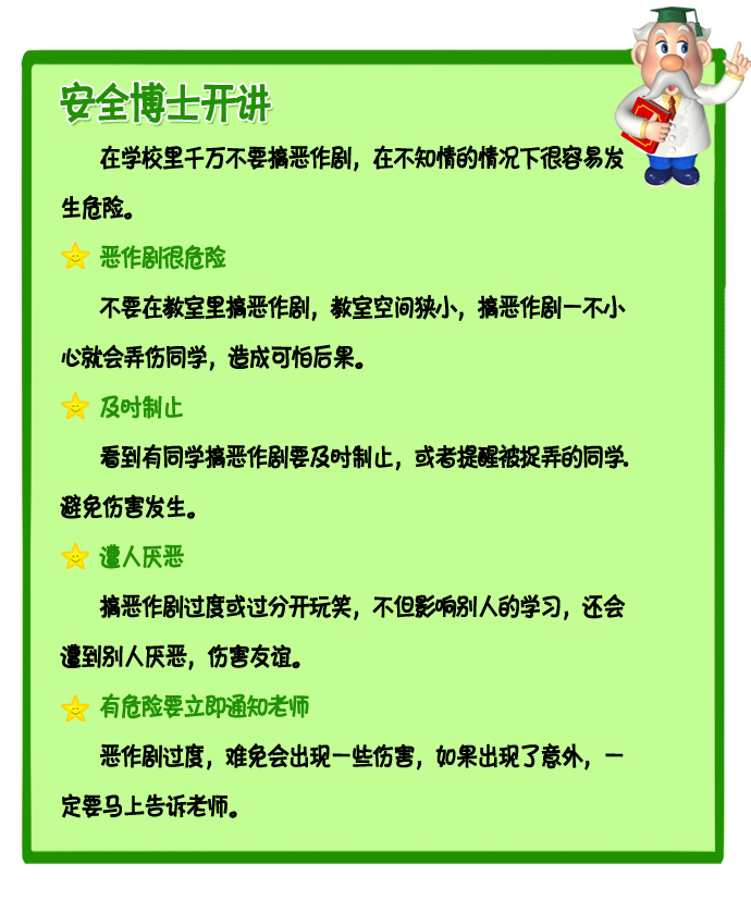 和同学千万不要搞恶作剧,有时会给别人造成严重的伤害。和同学玩耍嬉戏时,一定要适度。