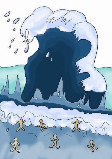 水下地震、火山爆发或水下塌陷和滑坡等激起的巨浪在涌向海湾和海港时所形成的破坏性的大浪称为海啸。破坏性的地震海啸,只在出现垂直断层,里氏震级大于6.5级的条件下才能发生。全球地震海啸发生区的分布基本上与地震带一致。破坏性较大的地震海啸平均六、七年发生一次,其中约80%发生在环太平洋地震带上。当海底地震导致海底变形时,变形地区附近的水体产生巨大波动,海啸就产生了。海啸是一种严重的自然灾害,会给人类的生产和生活带来巨大的损害。剧烈震动之后不久,巨浪呼啸,以摧枯拉朽之势,越过海岸线,越过田野,迅猛地袭击着岸边的城市和村庄,霎时人们和所有的建筑都会消失在巨浪中。